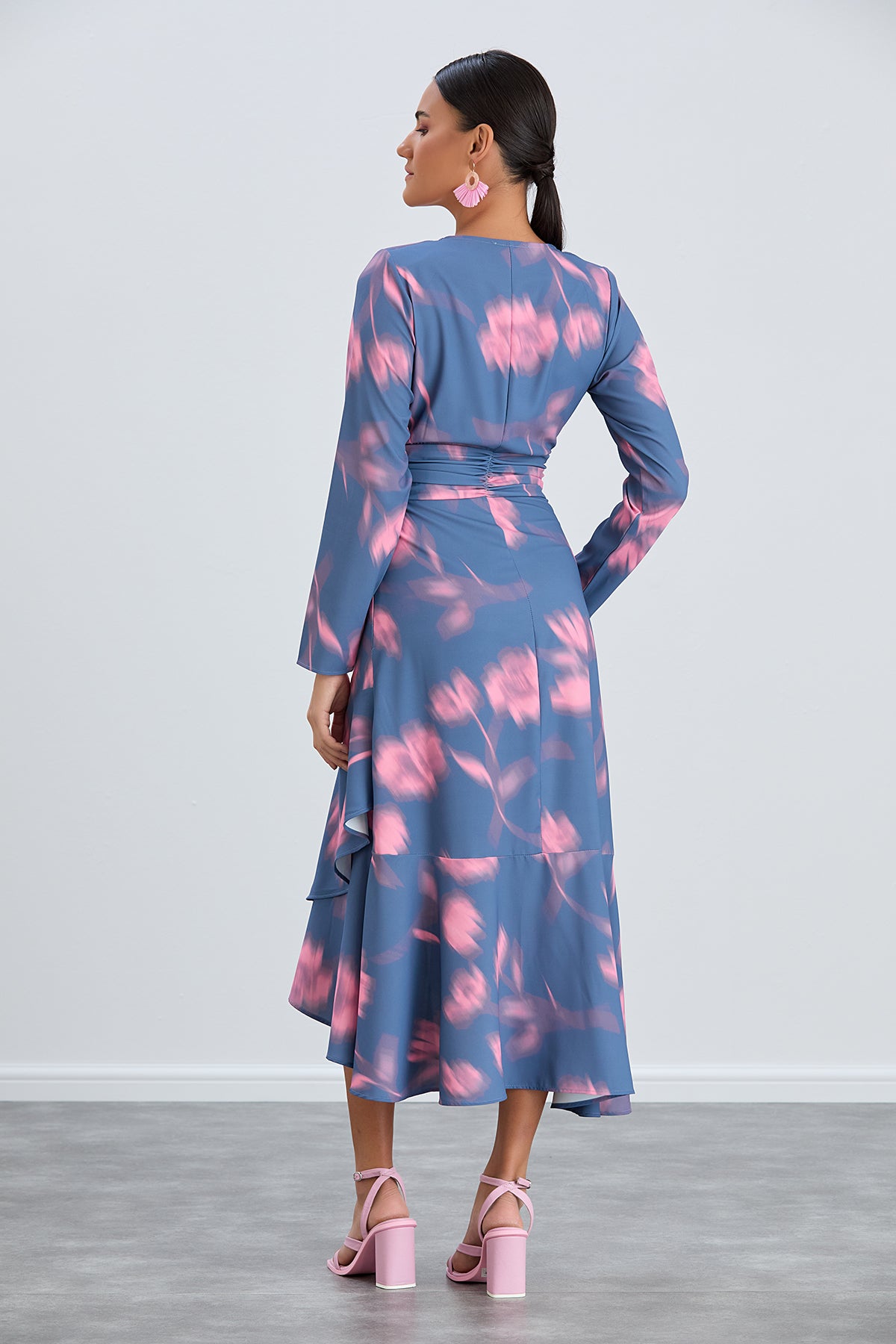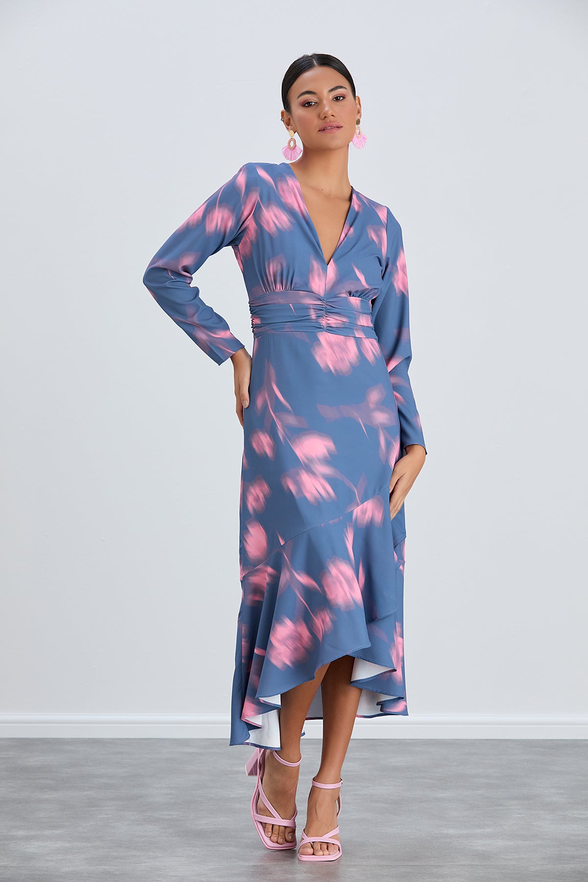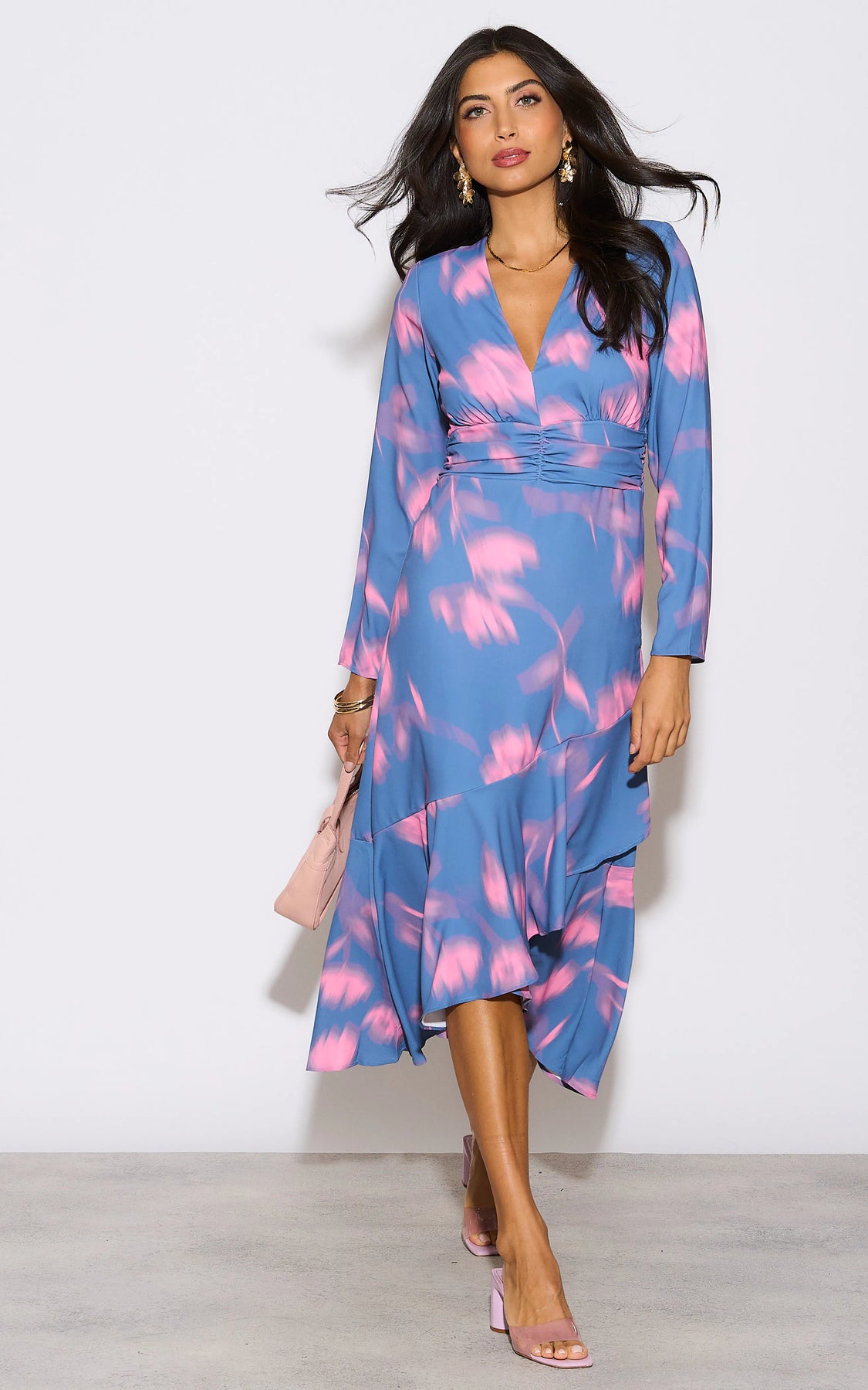 Elevate your collection with the Long Sleeve Frill Midi Dress in Blue with Pink Floral Print!